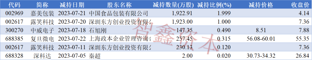 截至2023年7月24日17点,涉及股东减持的前五名上市公司分别为:露笑科技2153.13万股、嘉美包装1922.91万股、复旦微电257.45万股、中威电子147.35万股、深科达2万股。