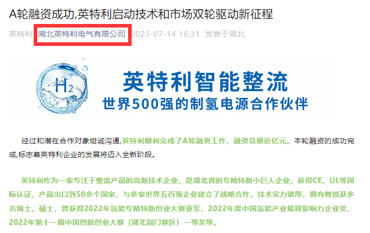 日前,湖北英特利电气有限公司公众号报道称,经过充分沟通,企业已经顺利完成了A轮融资,虽然具体融资金额没有透露,但文中称为“融资总额近亿元”,并表示所获资金将会用于加大制氢相应技术研发投入,其余资金将拓宽产品渠道。