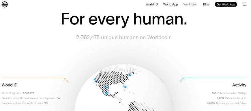 在北京时间周一下午15点,奥尔特曼麾下的Worldcoin项目正式启动。根据官网数据显示,目前全球通过虹膜扫描认证并注册的账目数量总共达到206万。目前用来扫描虹膜的设备“The Orbs”总共生产了2000台,其中有298台在过去一个月处于活跃状态。