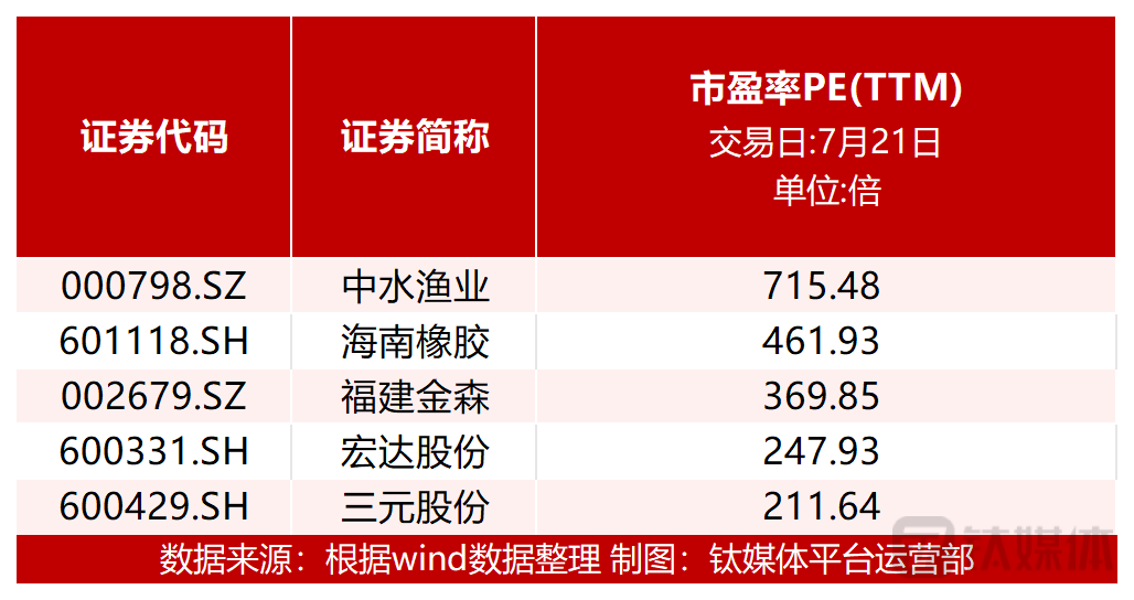 农业市盈率前5的个股分别为:中水渔业(000798.SZ)的市盈率为715.48倍;海南橡胶(601118.SH)的市盈率为461.93倍;福建金森(002679.SZ)的市盈率为369.85倍;宏达股份(600331.SH)的市盈率为247.93倍;三元股份(600429.SH)的市盈率为211.64倍。