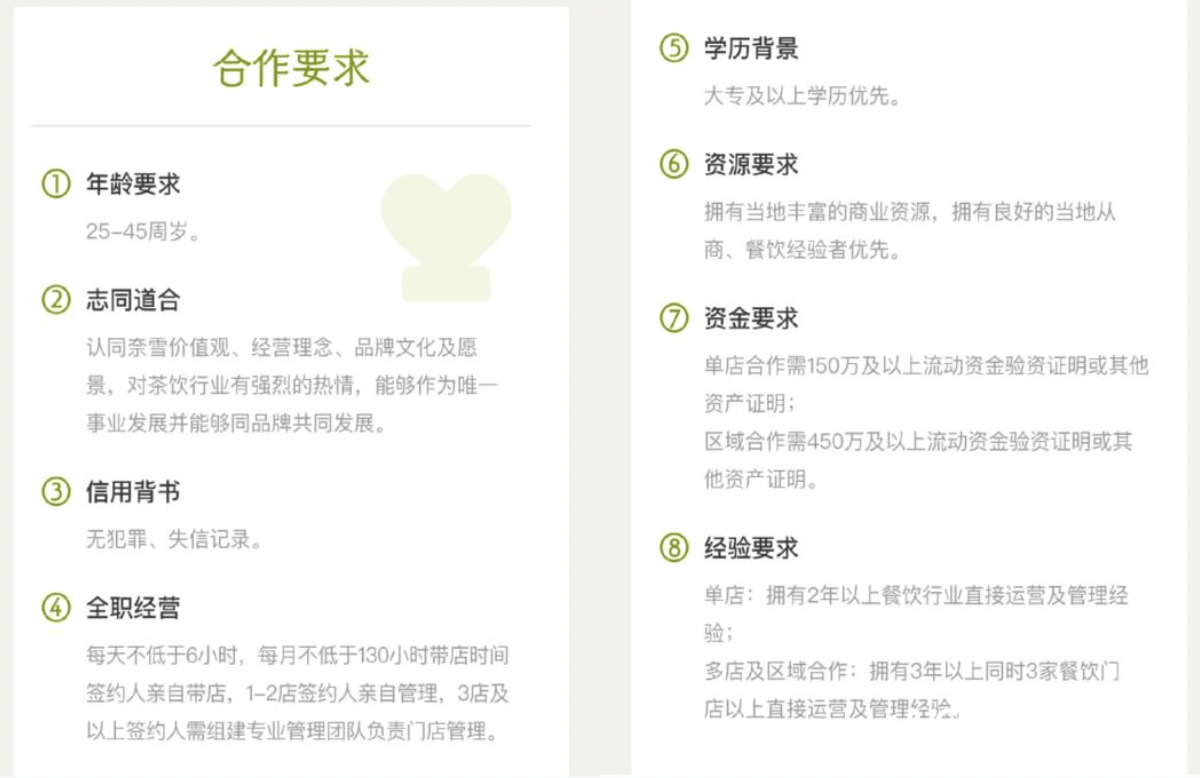 根据加盟细则,投资资金方面,加盟单店投资金额约100万元,合伙人验资门槛150万元,区域合作则在450万元及以上。相比之下,加盟其他新茶饮成本更低。去年11月,喜茶确认开放加盟业务,将在非一线城市展开事业合伙业务,主推50平方米以内大小、加盟费用50万元以内的店型。其余,如蜜雪冰城的投入则为37万元起,一点点为38万元,茶百道约为35万元,行业内其他品牌的加盟费用大多在35万至40万元之间。