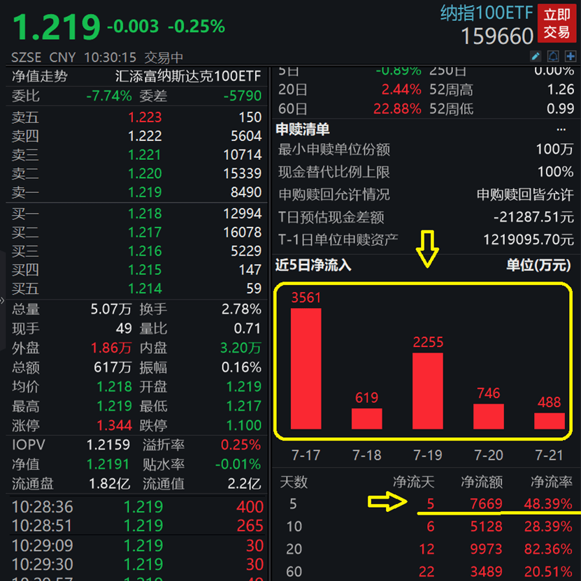 因此,纳斯达克市场作为全球科技公司发展的摇篮,今年以来表现优异。截至7月21日,纳斯达克指数年内涨34.07%,纳斯达克100指数涨幅更是高达41.01%,领涨全球主要指数!主打低费率的纳指100ETF(159660)上周5个交易日连续获得资金净申购合计达7669万元!