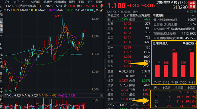 上交所权威数据显示,截至7月21日最新数据,资金已连续7日增仓纳指生物科技ETF(513290),近5日、10日、20日区间内,纳指生物科技ETF(513290)均呈资金净流入状态,近20日累计净流入额超2100万元,资金持续借道ETF播种美股创新药板块!