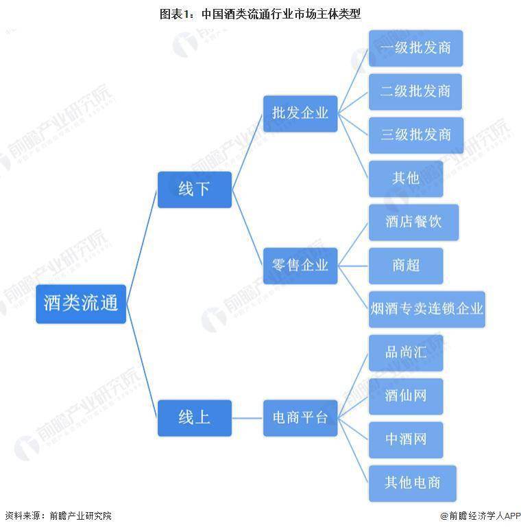酒类流通行业市场主体类型包括酒类批发企业、电商平台以及零售平台,批发企业具体可分为中间批发商,包括一级批发商、二级批发商等 ; 电商平台则包括早期兴起的 B2C 平台,如品尚汇、1919 等专业酒类流通电商平台 ; 零售企业包括酒店餐饮、商超、烟酒专卖连锁企业等。