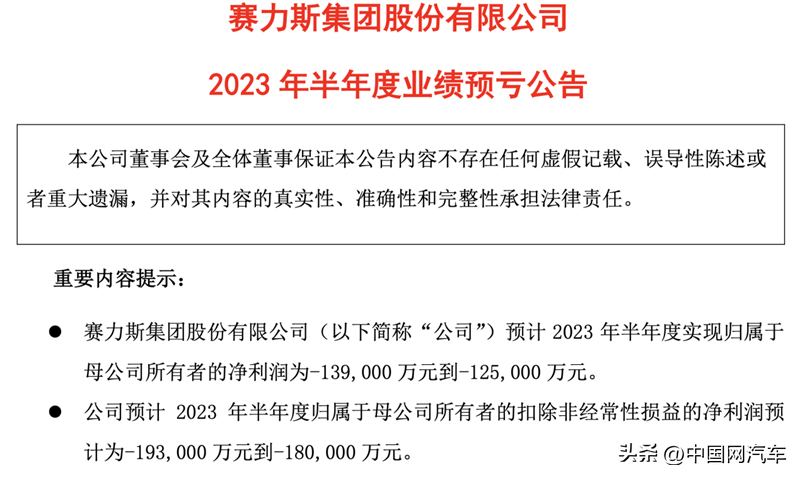 赛力斯发布公告称今年上半年预计亏损高达12.5亿元-13.9亿元,扣除非经常性损益后的亏损更是高达18亿元-19.3亿元。