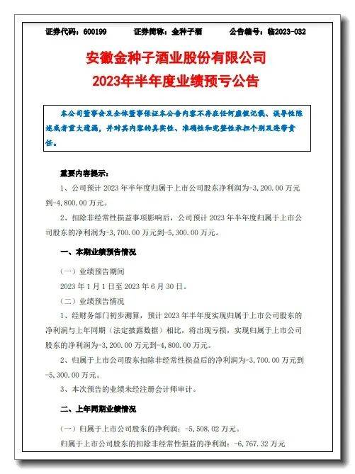 金种子酒7月14日发布2023年半年度业绩预告,预计上半年净利润亏损3200万元至4800万元。扣除非经常性损益事项影响后,公司预计2023年半年度归属于上市公司股东的净利润亏损3700万元到5300万元。