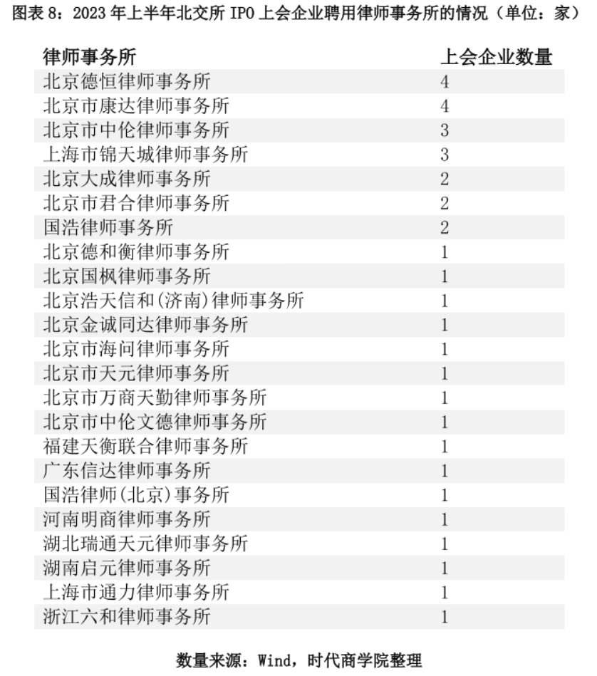 图表8:2023年上半年北交所IPO上会企业聘用律师事务所的情况(单位:家)