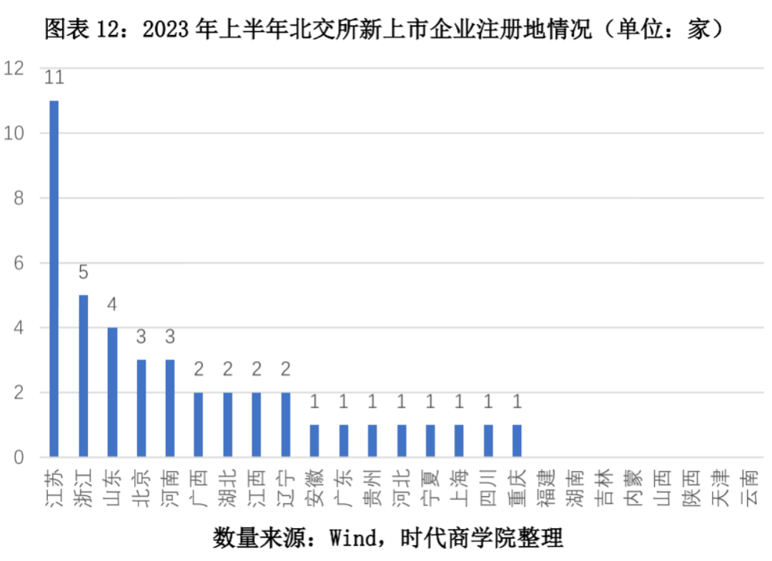图表12:2023年上半年北交所新上市企业注册地情况(单位:家)