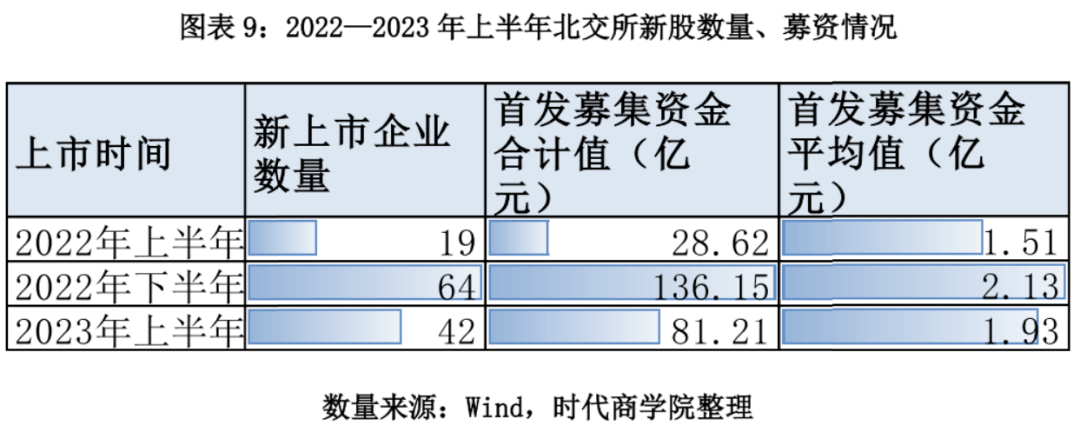 据Wind数据,如图表9所示,2022年上半年、2022年下半年、2023年上半年,北交所的新上市企业数量分别为19家、64家、42家。