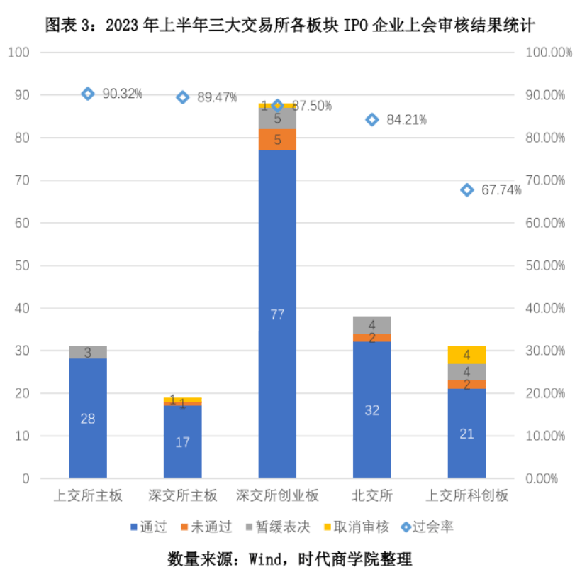 图表3:2023年上半年三大交易所各板块IPO企业上会审核结果统计