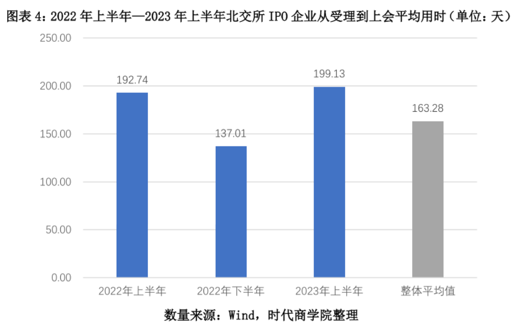 据Wind数据统计,如图表4所示,2023年上半年,北交所上会企业从受理到上会平均用时199.13天,同比增长3.32%,较2022年下半年环比增长45.34%。