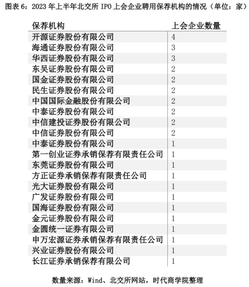 图表6:2023年上半年北交所IPO上会企业聘用保荐机构的情况(单位:家)