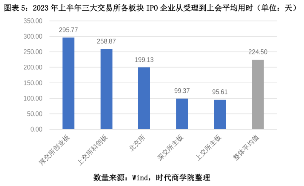 据Wind数据统计,如图表5所示,2023年上半年,深交所创业板、上交所科创板、北交所、深交所主板、上交所主板的上会企业,从受理到上会等待时长平均值分别为295.77天、258.87天、199.13天、99.37天、95.61天,A股整体平均值为224.50天,北交所低于A股整体平均值。