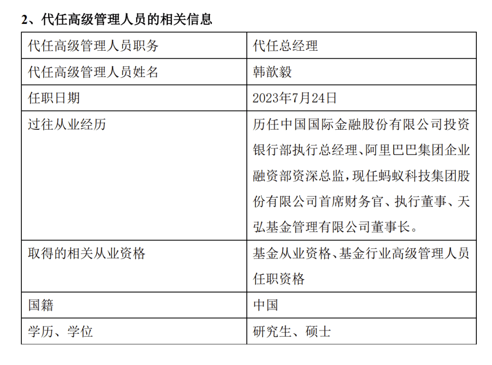 7月24日晚间,天弘基金发布公告称,公司董事会已批准郭树强先生因个人原因辞任公司董事、总经理的申请。公告还显示,总经理职务将由董事长韩歆毅暂时代任,代任时长不超过六个月。当晚,天弘基金内部也发布全员信表示,公司将继续稳步经营、平稳发展,董事会也将按照公司章程进一步遴选合适的总经理人选。