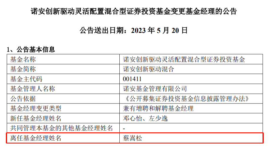根据彼时诺安基金的公告,诺安创新驱动变更基金经理,蔡嵩松离任,由邓心怡、左少逸继任。