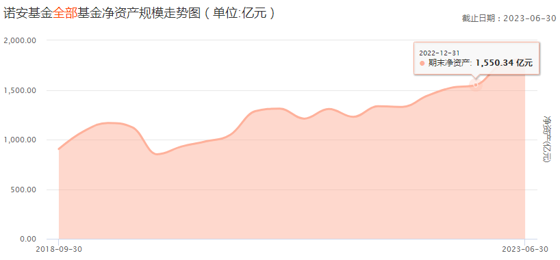 资料显示,诺安基金成立于2003年,截至2022年末,其管理资产规模1550.3亿元,在195家基金公司中排名第35位。