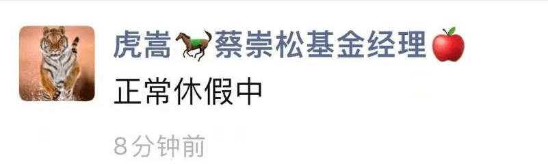 面对汹涌的舆论,蔡嵩松深夜在朋友圈回应“正常休假中”。紧接着诺安基金也对媒体表示,“蔡嵩松目前在休假中,其管理的相关产品运作一切正常”。