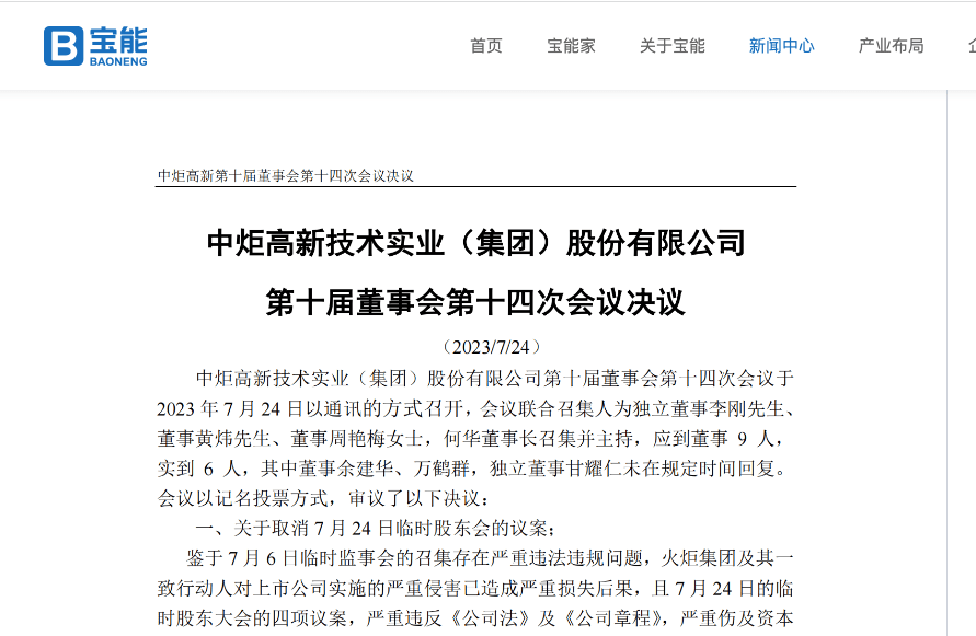 就在下午临时股东大会正在进行时,宝能集团就在官网公布了名为“中炬高新第十届董事会第十四次会议决议”的公告,其中提到,中炬高新临时股东大会不符合公司章程规定,拟由中炬高新发布公告取消7月24日临时股东会,待诉讼相关事项落定后再行召开。