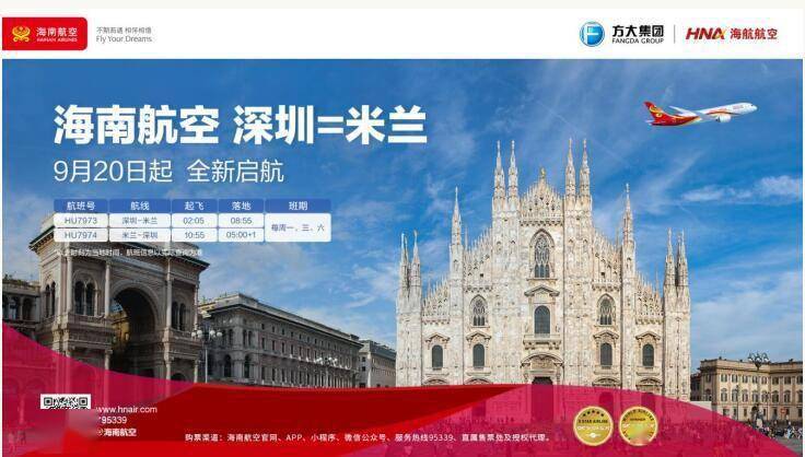 7月24日,据海南航空消息,海南航空计划于9月20日起新开通深圳⇌米兰国际航线,这是海南航空继重庆⇌罗马、深圳⇌罗马航线后的第三条直飞意大利的航线,也是海南航空在深圳出港的第六条洲际航线。