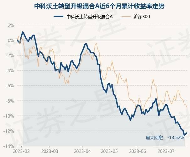 7月24日,中科沃土转型升级混合A最新单位净值为0.9432元,累计净值为0.9432元,较前一交易日上涨0.19%。历史数据显示该基金近1个月下跌3.8%,近3个月下跌6.88%,近6个月下跌12.31%,近1年下跌10.6%。该基金近6个月的累计收益率走势如下图: