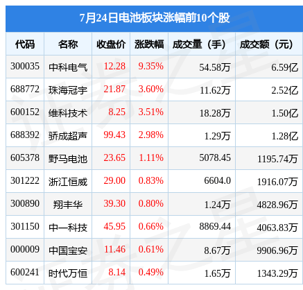 7月24日电池板块较上一交易日下跌1.36%,星云股份领跌。当日上证指数报收于3164.16,下跌0.11%。深证成指报收于10747.79,下跌0.58%。电池板块个股涨跌见下表: