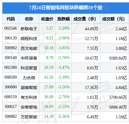 7月24日智能电网板块较上一交易日上涨0.24%,亚联发展领涨。当日上证指数报收于3164.16,下跌0.11%。深证成指报收于10747.79,下跌0.58%。智能电网板块个股涨跌见下表: