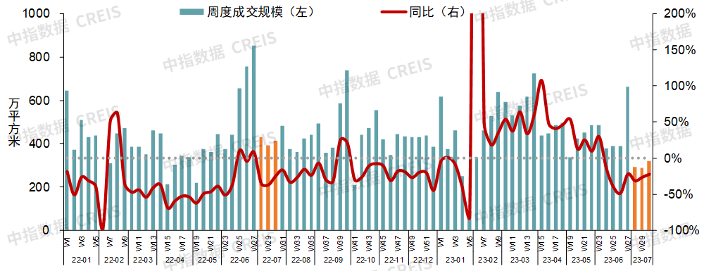图:重点50城商品住宅周度成交面积及其同比变化