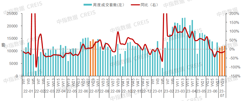 图:重点9城二手住宅周度成交套数及其同比变化