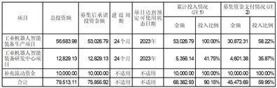 首次公开发行募投项目“工业机器人智能装备生产项目”和“工业机器人智能装备研发中心项目”建设于同一块工业用地上,前者主要提升公司的生产能力,后者主要增强公司的研发能力。考虑到公司订单持续快速增长,而且受外部环境影响,公司物资采购、物流运输、施工人员流动均受到不同程度影响,募投项目的工程施工进度有所延迟,因此为了尽快满足订单增长需求,公司优先实施“工业机器人智能装备生产项目”以加快提升产能,因此“研发中心项目”建设有所推迟。截至2023年6月末,“工业机器人智能装备生产项目”已完工转固并投入使用, “研发中心项目”已经完成研发实验室的建设及部分装修,后续主要投入为装修、研发设备的采购、安装及调试。