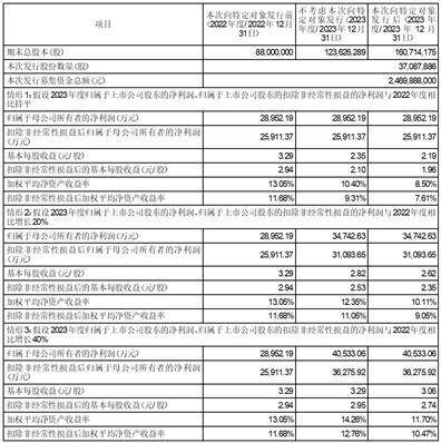 上述测算中,每股收益按照《公开发行证券的公司信息披露编报规则第9号一一净资产收益率和每股收益的计算及披露》(2010年修订)的规定进行了计算。公司对2023年度净利润及扣除非经常性损益后净利润的假设分析是为了便于投资者理解本次发行对即期回报的摊薄,并不构成公司的盈利预测,投资者不应据此进行投资决策,投资者据此进行投资决策造成的损失,公司不承担赔偿责任。