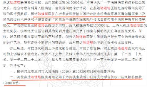 法院认为河北燕达陆道培医院不能证明医院主张该诊疗行为不会为患者带来其他医疗风险,因此责令河北燕达陆道培医院赔偿患者120万元。
