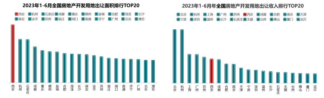 从先行土地指标上看,2023年上半年各大房企纷纷重仓西安,在西安土地市场收获颇丰,使得西安在房地产用地出让规模排名上冲到了全国第一,土地出让金超过430亿,同比去年上涨326%,位居全国第四。
