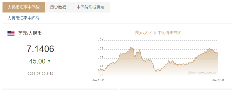 金融界7月25日消息人民币对美元中间价调升45个基点,报7.1406。隔夜离岸人民币一度升破7.18元。