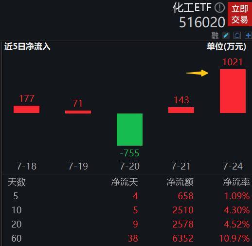 本周一(7月24日)化工板块大幅回调,资金出现较为一致的增仓动作,相关行业ETF逢低吸纳迹象明显。