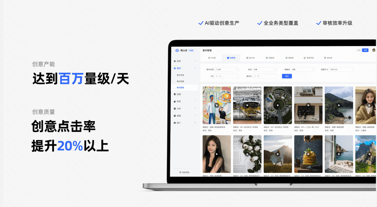 针对创意质量,爬山虎2.0进行了创意理解模型升级,大幅提升创意理解能力,优化创意质量,创意点击率提升20%以上。通过创意分析能力的全面优化,便于业务快速查看创意供给、效果、爆款创意情况,有效提升了决策效率。