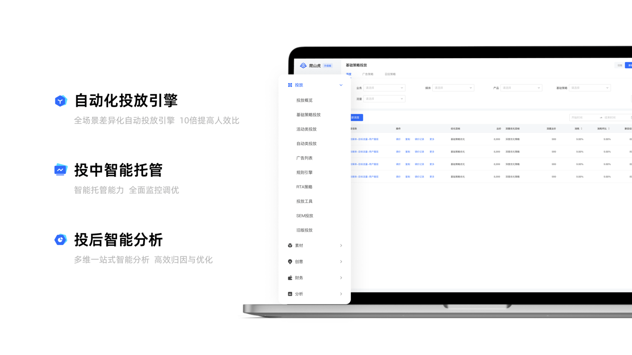 面对基础投放工作占用运营80%以上精力的状况,爬山虎针对调价和补充投放创意内容两大高频且耗时的工作环节,提供自动化工具,一方面自动化调价出价,为投放运营节省60%以上的调价时间;此外,抽象出投放策略,辅助运营的管理和配置投放,大幅提升配置效率。据了解,通过对投放方式和能力的迭代,以及对投放策略的产品化、精细化挖掘,爬山虎有效提升了投放效率和流量质量。