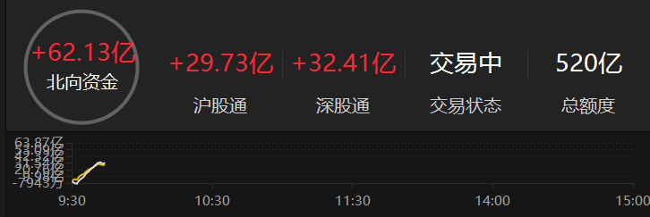 上证报中国证券网讯 截至9时44分,北向资金净买入超60亿元,达62.13亿元。