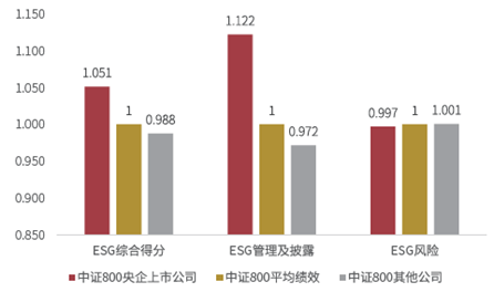 从公司性质来看,中证800成分股公司中,央企控股上市公司在ESG综合绩效、ESG管理及披露、ESG风险3个维度均优于指数内其他类型公司。