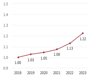 以2018年ESG评级为基数,中证800成分股ESG评级平均得分在5年间提升了22%,2023年得分增速提升了近一倍。