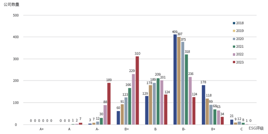 近一年,A股上市公司ESG综合评级提升呈加速之趋势。其中中证800成分股,ESG评级在B+级(含)以上的公司数量从2018年的63家增至2023年的506家,评级在C+级(含)以下的公司数量从2018年的199家降至34家。
