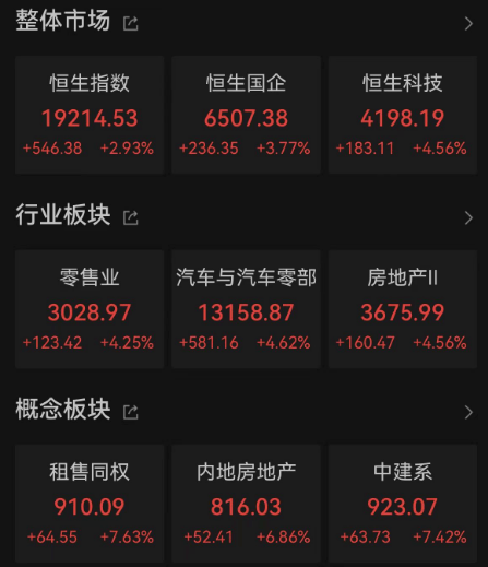 7月25日早盘,港股显著走高,恒生指数涨约3%,恒生科技指数涨近4%。零售、汽车和房地产板块领涨。