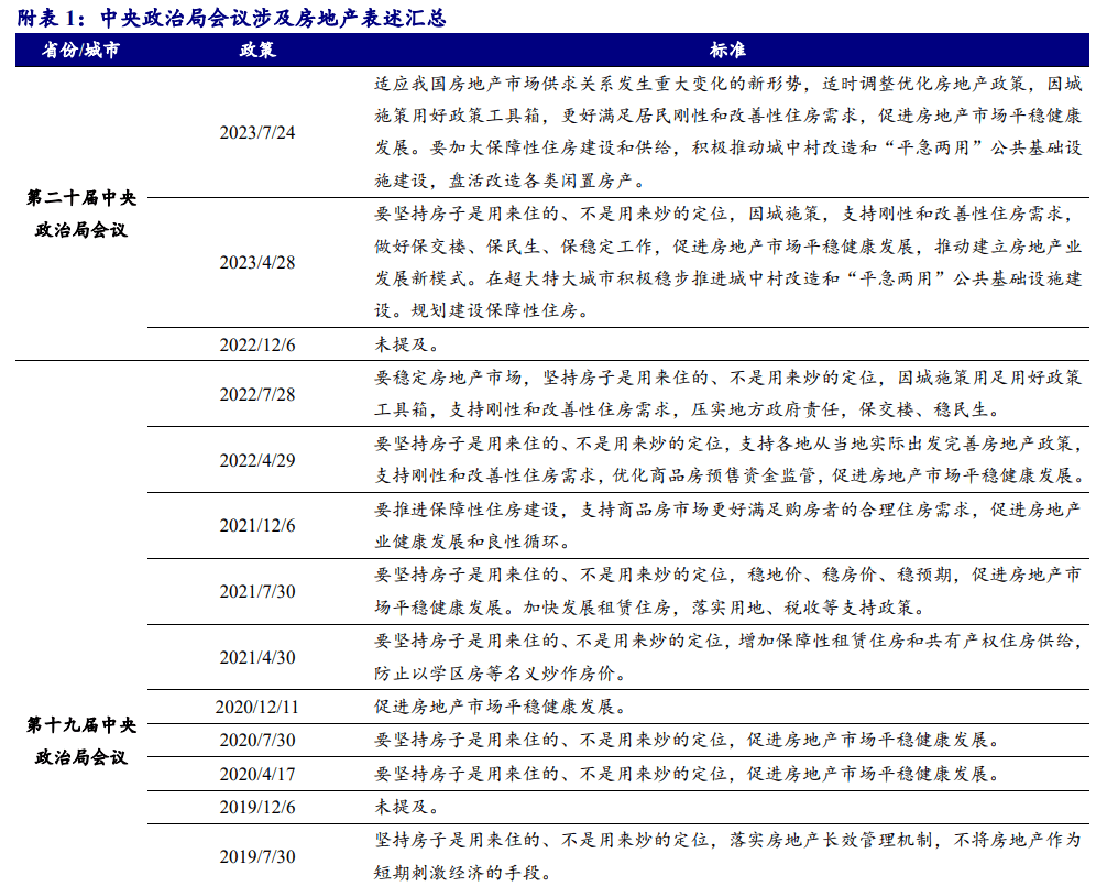 会议指出要切实防范化解重点领域风险,适应我国房地产市场供求关系发生重大变化的新形势,适时调整优化房地产政策,因城施策用好政策工具箱,更好满足居民刚性和改善性住房需求,促进房地产市场平稳健康发展。要加大保障性住房建设和供给,积极推动城中村改造和“平急两用”公共基础设施建设,盘活改造各类闲置房产。本次政治局会议提出适时调整优化房地产政策。2022年以来,三四线和非核心二线城市的“四限”基本已放开,核心二线城市限购、限售和公积金政策均有所放松,首套房贷利率也大幅下降。当前一线和强二线城市的购房政策仍有放松空间,政治局会议后,这部分城市的限购和限贷或将成为新的政策发力点,包括认房认贷标准、非核心区域限购、存量房贷利率、交易税率等都有调整空间。