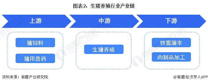 从生猪养殖产业链来看,上游主要由猪饲料与猪用兽药行业构成,生猪养殖行业处于产业链的中游位置,下游主要由牲畜屠宰行业与肉制品加工行业构成,最终产品流向终端消费市场。
