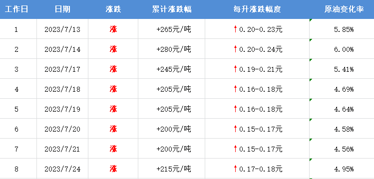 7月24日,本轮油价计价统计周期第8个工作日,当前参考原油变化率为4.95%,预计汽柴油累计上调215元/吨,折算为每升油价预涨0.17-0.18元。
