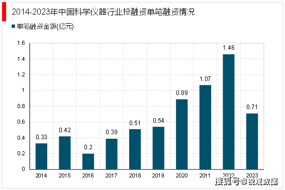 从单笔融资金额来看,2014-2023年除2021年和2022年的单笔融资金额上升到1亿元以上外,其他年份的单笔融资金额均未超过1亿元。2022年单笔融资金额上升至1.46亿元。