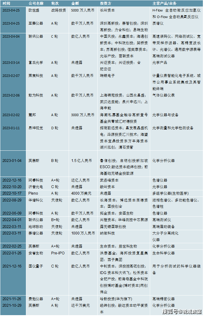 图表:2022-2023年中国科学仪器行业投融资事件汇总