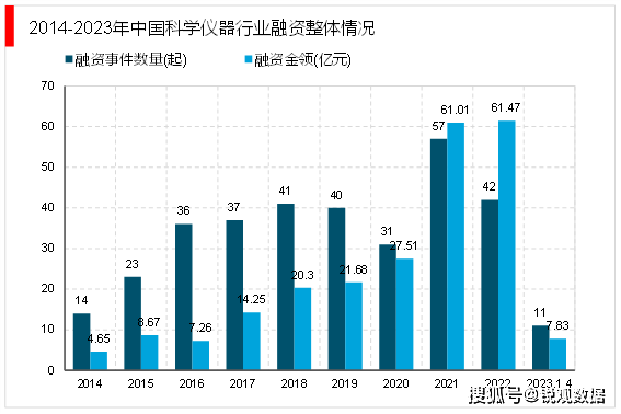 2021年我国科学仪器行业融资达到顶峰,发生融资事件共57起,融资金额共61.01亿元。2021年后我国科学仪器行业遇冷,融资事件和金额均有所下降。2023年1-4月,我国科学仪器行业投融资事件11起,融资金额总7.83亿元。