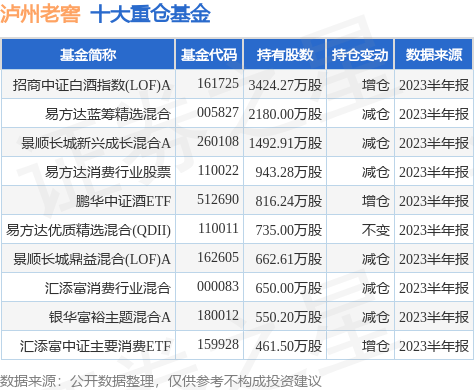 根据2023半年报公募基金重仓股数据,重仓该股的公募基金共651家,其中持有数量最多的公募基金为招商中证白酒指数(LOF)A。招商中证白酒指数(LOF)A目前规模为421.63亿元,最新净值1.0556(7月24日),较上一交易日下跌1.06%,近一年下跌10.66%。该公募基金现任基金经理为侯昊。侯昊在任的基金产品包括:招商大宗商品(LOF),管理时间为2017年9月5日至今,期间收益率为18.56%;招商中证银行指数A,管理时间为2017年9月5日至今,期间收益率为19.81%;招商中证煤炭等权指数(LOF)A,管理时间为2017年9月5日至今,期间收益率为33.28%。