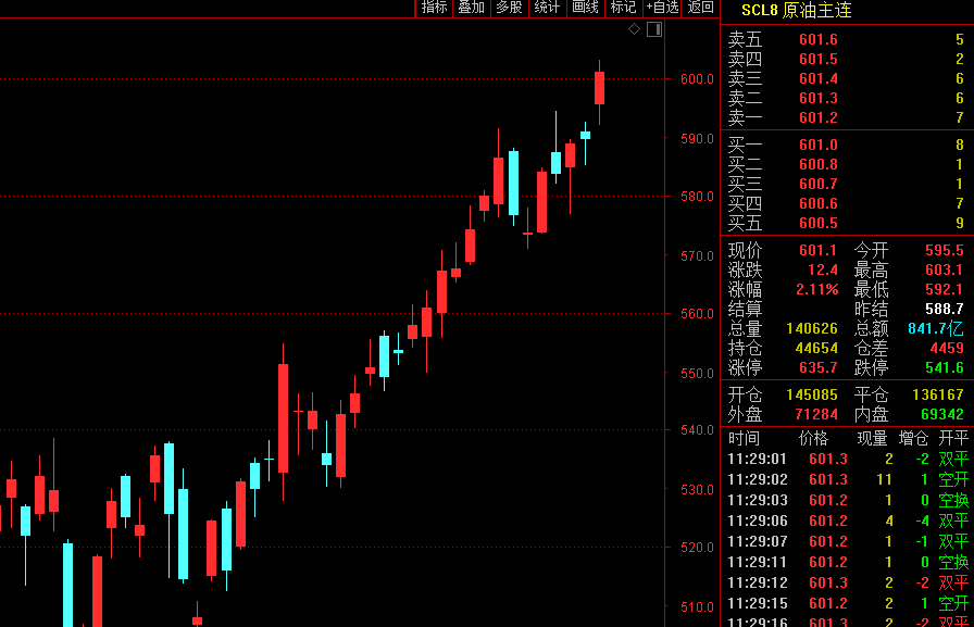 国际市场影响下,上海原油价格夜盘上涨,主力期约2309以601.5元/桶收盘,上涨12.8元/桶,涨幅为2.17%。而在7月25日早间,该主力合约继续上行,盘中已达到603元/桶上方,不断刷新年内高点。