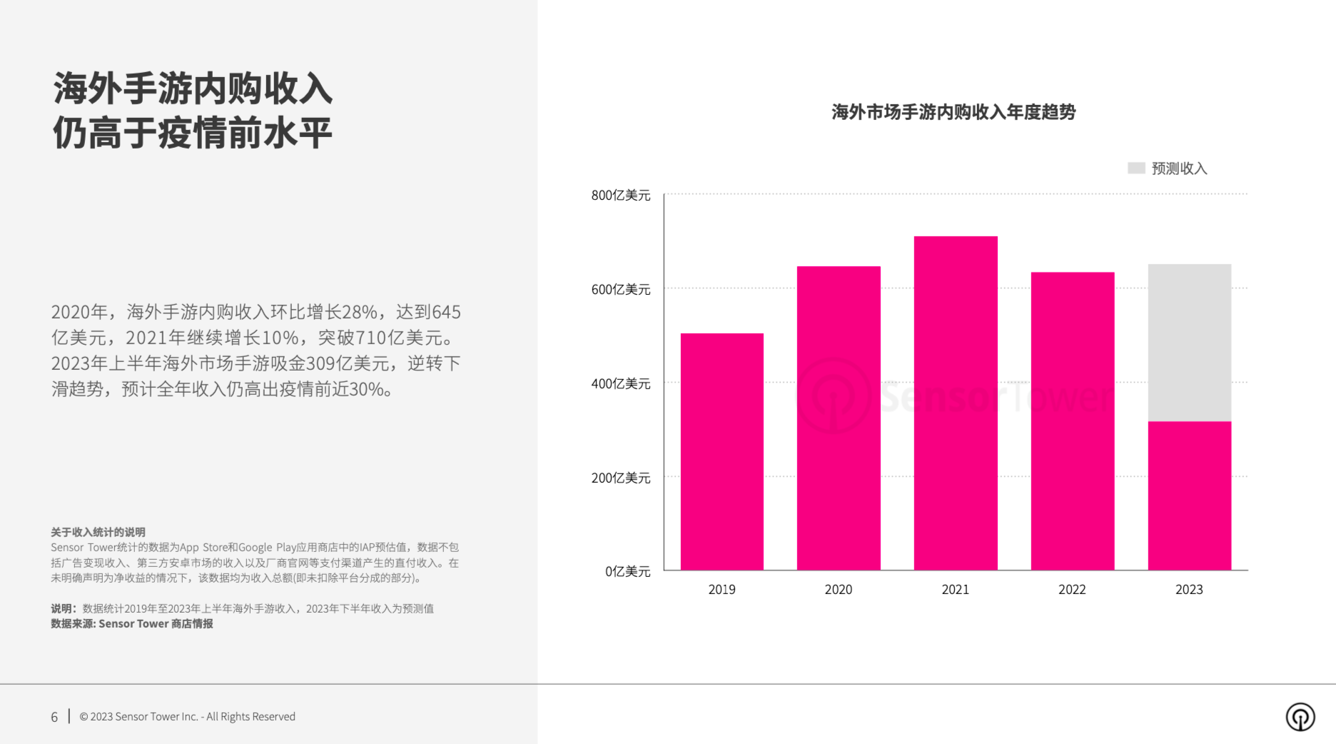 2020年至2021年,海外手游内购收入连续增长28%和10%,突破710亿美元。虽然在2022年随着后疫情时代的到来,全球手游收入出现不同程度的回落,但2023年上半年海外手游市场收入达到309亿美元,逆转下滑趋势。
